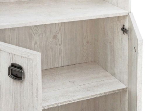 Шкаф разделен на 2 отделения: верхнее –открытое отделение с полками, нижнее – отделение за распашными дверями, за которыми расположена 1 полка