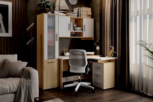 Данная надстройка оборудована вместительными полками, предназначенными для хранения книг, учебников, папок и другой необходимой документации. Также на этих полках можно разместить офисную технику, такую как сканер или принтер. Особенностью дизайна является фасад закрытой ниши с оригинальным принтерным рисунком.