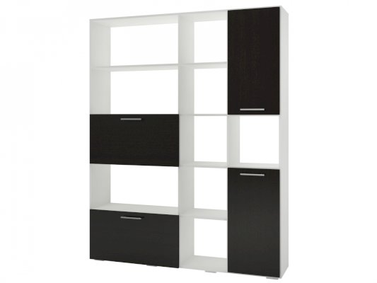 Применение задней стенки из ЛДСП (в ячейках с фасадами) позволяет использовать данный стеллаж для зонирования пространства (чтобы предотвратить опрокидывание, необходимо обеспечить крепление стеллажа к стене).