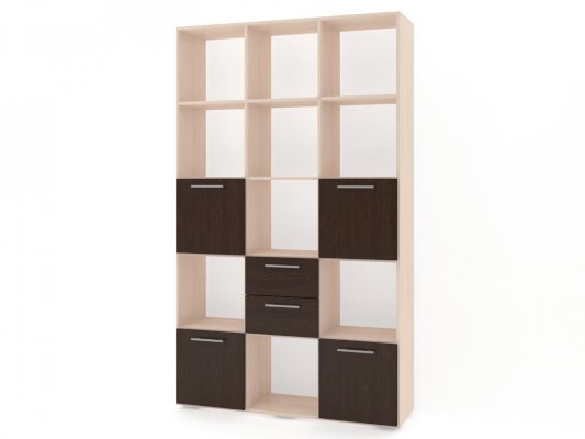 Применение задней стенки из ЛДСП (в ячейках с ящиками и фасадами) позволяет использовать данный стеллаж для зонирования пространства (чтобы предотвратить опрокидывание, необходимо обеспечить крепление стеллажа к стене).