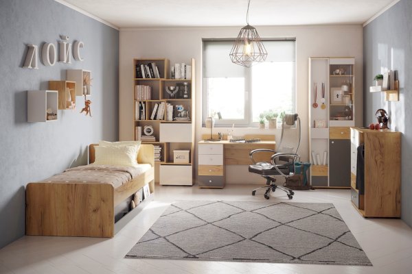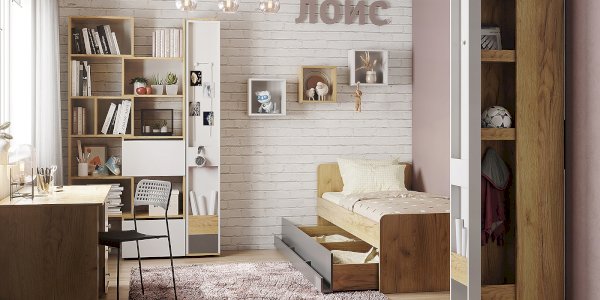 Кровать выполнена как подростковая кровать-тахта с большим выкатным ящиком на роликах. Изголовье и изножье со скругленными углами облицованы ударопрочной кромкой ПВХ 2 мм, что, безусловно, немаловажно для детей и родителей, выбирающих мебель. Обратите внимание, что изножье совсем не высокое и не будет мешать садиться на кровать даже с этой стороны, поэтому кровать можно ставить не только у стены.