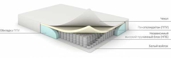В составе матраса 2 слоя: высококачественный пенополиуретан - 3 см(ППУ ST) и блок независимых пружин - 14 см (НПБ). Увеличенная высота НПБ, по сравнению с матрасом "Супер Комфорт", позволяет наилучшим образом распределить нагрузку, благодаря чему отдых на матрасе можно смело приравнять ко сну на полноценной кровати.
