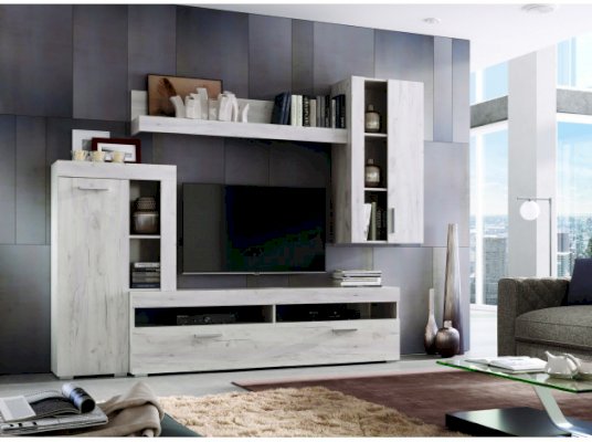 Преимущества: вместительная — множество открытых и закрытых полок для мультимедиа аппаратуры, книг, сувениров и предметов декора; стильная — минималистичный дизайн гармонирует с оригинальным цветовым исполнением; функциональное наполнение — включает ТВ-тумбу, большую навесную полку и два небольших, но функциональных шкафа.