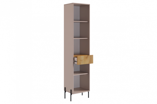 Особенностью стеллажа "Доминика" является выкатной ящик, который обеспечивает дополнительное пространство для хранения. Фасад ящика украшен декоративным элементом в цвете "дуб крафт золотой", придающим стеллажу элегантный и роскошный вид.