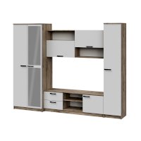 • Гостиная состоит из трёх модулей (шкаф платяной, шкаф бельевой, средняя секция), которые при желании можно устанавливать отдельно друг от друга, размещая в разных комнатах