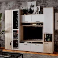 Компактный гарнитур «Лукас» – это функциональная стилизованная модель с простыми геометрическими формами и множеством полезного пространства. Контрастное сочетание фасадов белого цвета с древесной фактурой дуб сонома, а также отделка зеркалами станут ярким акцентом любого интерьера.