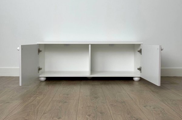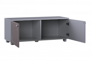 Тумба оснащена двумя распашными дверцами, за которыми располагается вместительное внутреннее пространство для хранения книг, игрушек, текстиля и других необходимых вещей. Такое решение позволяет скрыть содержимое и сохранить аккуратный внешний вид комнаты.