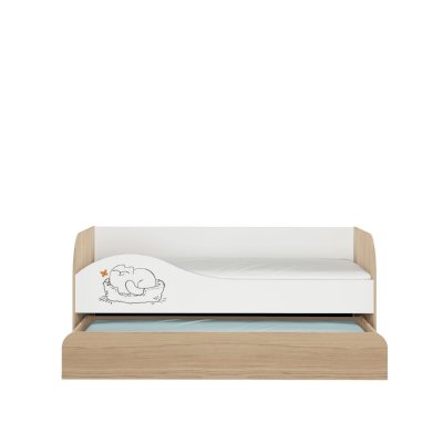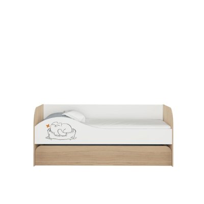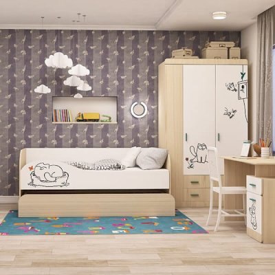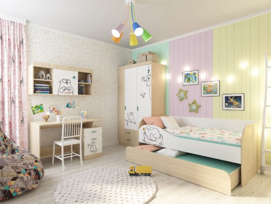 В общем кровать понравилась. Радует что второе место не очень высоко как в двухьярусных кроватях. Т к тогда дети ссорились бы кто спит на верху. Экономит место т к на день задвигается нижнее спальное место. Милый котик радует глаз. Низ выкатывается на колесиках. Сборка по инструкции не заняла много времени.все края везде окантованы. Доставка вовремя, спасибо продавцу.