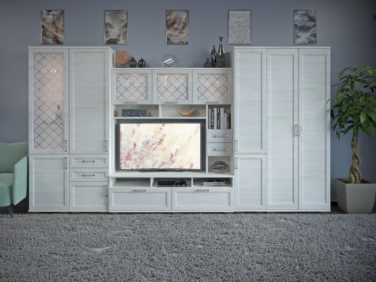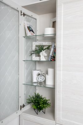 Витрина со стеклянной дверцей и боковиной, за которыми просматриваются полки и выставленные на них предметы. Стекло делает витрину визуально легкой, компактной, а всему помещению добавляет света и торжественности. Шкаф витрину можно использовать не только в сочетании с другими модулями гостиной, но и как отдельный предмет мебели.
